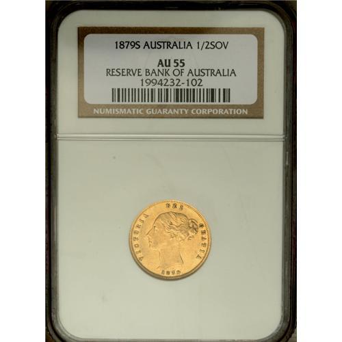 Victoria gold 1/2 Sovereign 1879S, KM5, AU55 NGC RBA, v