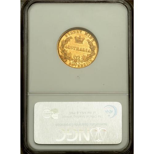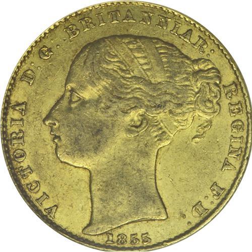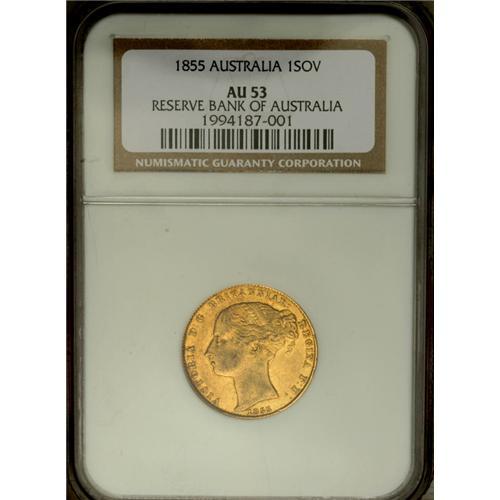 <B>Victoria gold Sovereign 1855, </B></I>KM2, AU53 NGC RBA, rare two-year type, an original coin with toning on the bust and mint luster in the recessed devices. This type is highly elusive in grades above VF.<BR><BR><b>Shipping:</b> Coin/Currency (<a target="_blank" href="http://www.heritageauctions.com/common/shipping.php">view shipping information</a>)