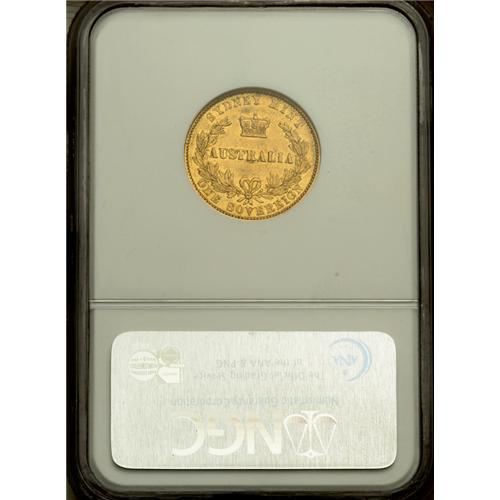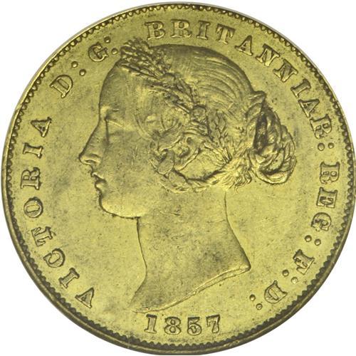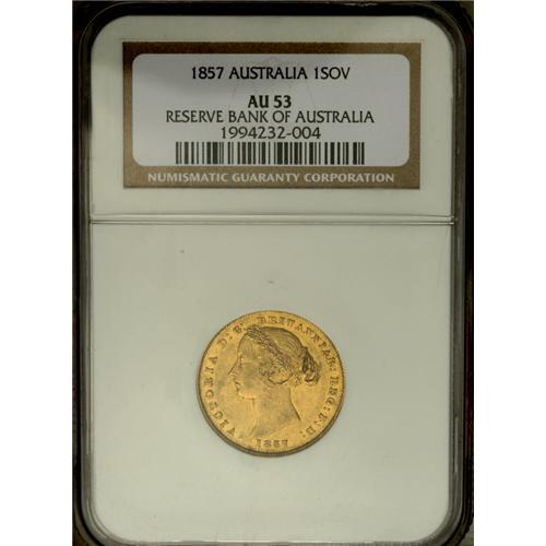 <B>Victoria gold Sovereign 1857, </B></I>KM4, AU53 NGC RBA, lightly toned with very sharp details. Scarce first date of the revised bust type.<BR><BR><b>Shipping:</b> Coin/Currency (<a target="_blank" href="http://www.heritageauctions.com/common/shipping.php">view shipping information</a>)