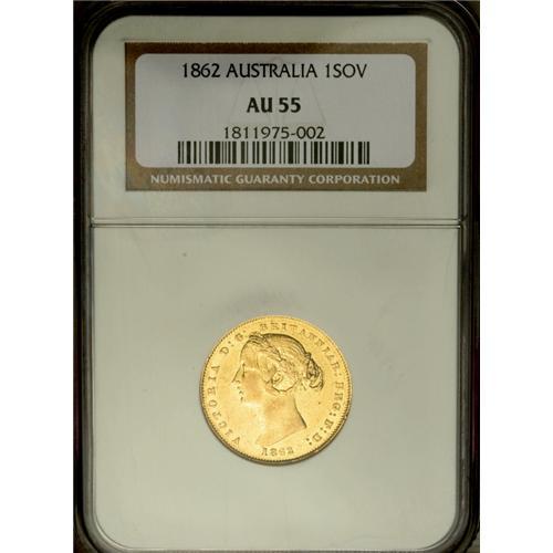 <B>Victoria gold Sovereign 1862, </B></I>KM4, AU55 NGC, highly lustrous, typical small surface marks. Very scarce date, the first we have offered in several years.<BR><BR><b>Shipping:</b> Coin/Currency (<a target="_blank" href="http://www.heritageauctions.com/common/shipping.php">view shipping information</a>)