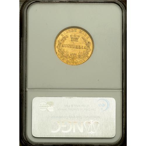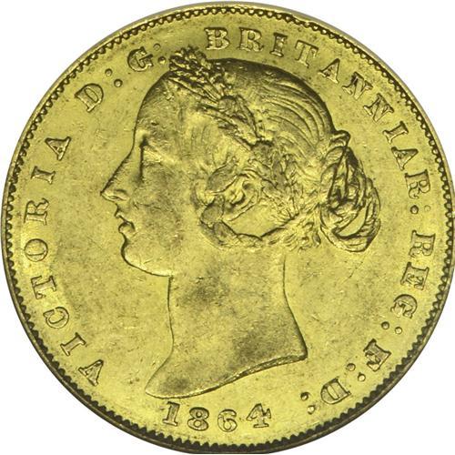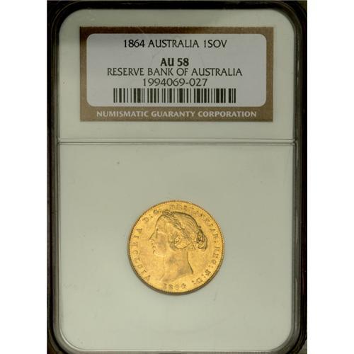 <B>Victoria gold Sovereign 1864, </B></I>KM4, AU58 NGC RBA, a highly lustrous coin and quite scarce in this designation.<BR><BR><b>Shipping:</b> Coin/Currency (<a target="_blank" href="http://www.heritageauctions.com/common/shipping.php">view shipping information</a>)