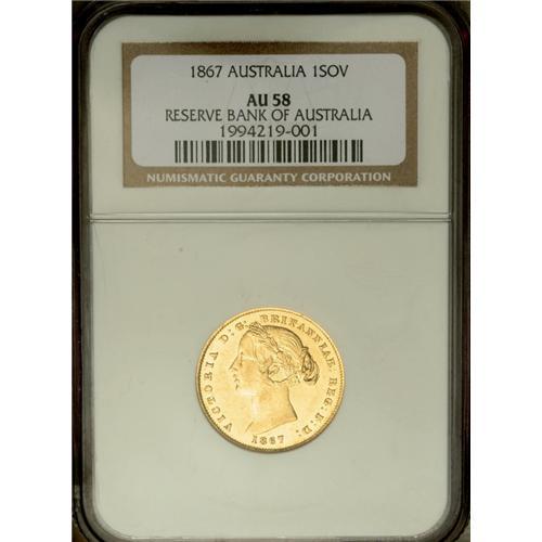 <B>Victoria gold Sovereign 1867, </B></I>KM4, AU58 NGC RBA, a choice example with brilliant mint luster and exceptional eye appeal, one of the nicer specimens of this type that you will see.<BR><BR><b>Shipping:</b> Coin/Currency (<a target="_blank" href="http://www.heritageauctions.com/common/shipping.php">view shipping information</a>)