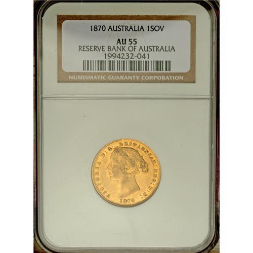 <B>Victoria gold Sovereign 1870, </B></I>KM4, AU55 NGC RBA, lustrous and attractive with no obvious flaws.<BR><BR><b>Shipping:</b> Coin/Currency (<a target="_blank" href="http://www.heritageauctions.com/common/shipping.php">view shipping information</a>)
