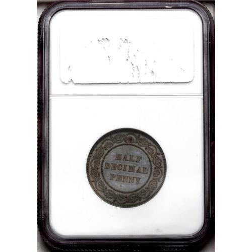 <B>Victoria pattern Decimal halfpenny, 1859. </B></I>P-1983 (extremely rare). PF63 BN NGC, Choice Proof, an especially lovely piece owing much of its design to the Canadian large cents of the same era. Luscious dark chocolate-colored surfaces with subtle mirrors in the fields, and blessed by a delicate blue iridescence.