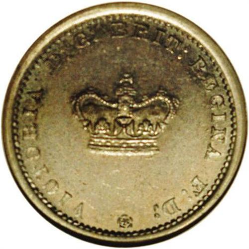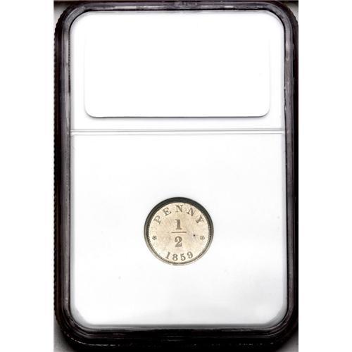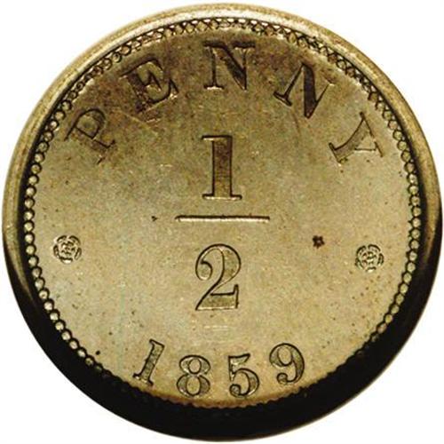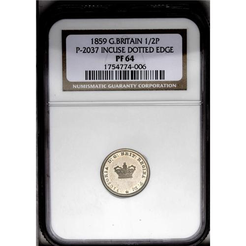 <B>Victoria pattern halfpenny, 1859. </B></I>P-2037 (extremely rare). PF64 NGC. Small crown centered on obverse. Variety with Incuse Dotted Edge. A beautiful piece from the same era as America's copper-nickel cents. Exceptionally Choice Proof, lovely color. Rarely seen, this came from an important collection dispersed last year, and was among its finest pieces.