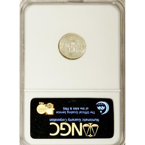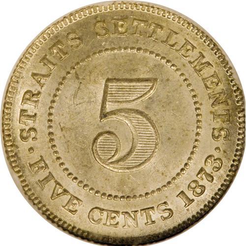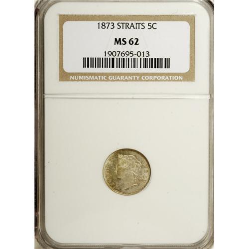 <B>Victoria silver 5 Cents 1873,</B></I> KM-10, one of several early key dates, MS62 NGC, snow-white luster with a hint of silvery gold tone, and sharply struck. Among the finest known of this diminutive rarity.<BR>Anyone unfamiliar with the history of this area of the world might wonder why such a small, seemingly unimportant coin could be worth so much, or be so rare. The Straits Settlements was the name given to a collection of territories of the British East India Company in Southeast Asia which were collectively administered by Great Britain as a crown colony beginning in 1826 during Britain's early imperial wanderings around the globe. Various territories between the Indian Ocean and the South China Sea were divided up by European explorers, and certain lands became known as the Straits Settlements by the Anglo-Dutch Treaty of 1824, which divided the Malay archipelago into a British zone in the north and a Dutch zone in the south. In April of 1867, the Settlements became a British crown colony, answerable to the Colonial Office in London instead of to the government of India based in Calcutta. A governor was appointed to direct the affairs of the citizenry, consisting mostly of Chinese, Malays and Indians. Commerce thrived as the native products were taken to a broader market, and a British colonial coinage commenced in 1871, mintages for the first few years being small, and most of those coins seem to have perished before the century expired. The Royal Mint contracted for the first coinage but produced only 62,000 5-Cents coins in 1871, none in 1872, and only another 60,000 in 1873 before turning production over to the Heaton Mint at Birmingham for a few years. A tiny handful of MS pieces appear to exist for each denomination from these early years. The little 5-Cents pieces circulated madly among the inhabitants, and are today among the rarest pieces from the beginnings of the Straits Settlements.<BR><BR><b>Shipping:</b> Coins & Currency (<a target="_blank" href="http://www.heritageauctions.com/common/shipping.php">view shipping information</a>)