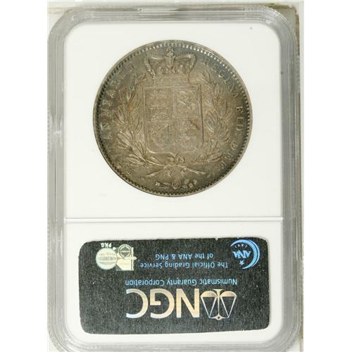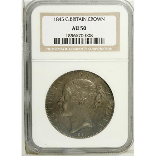 <B>Victoria silver Crown, 1845.</B></I> Young Head. S-3882. Edge not visible in the slab. AU50, NGC, dark gray.<BR><BR><b>Shipping:</b> Coin/Currency (<a target="_blank" href="http://www.heritageauctions.com/common/shipping.php">view shipping information</a>)