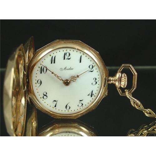 Nice 19th century Victorian 12kt Gold hunting case pocket watch by Aida, with floral engraved and multi-colored enamel adorned case with an unusual gem stone outer edge, clean white enamel dial, Arabic numeral hour designations, applied gold tone minute designations, fancy open work hands.