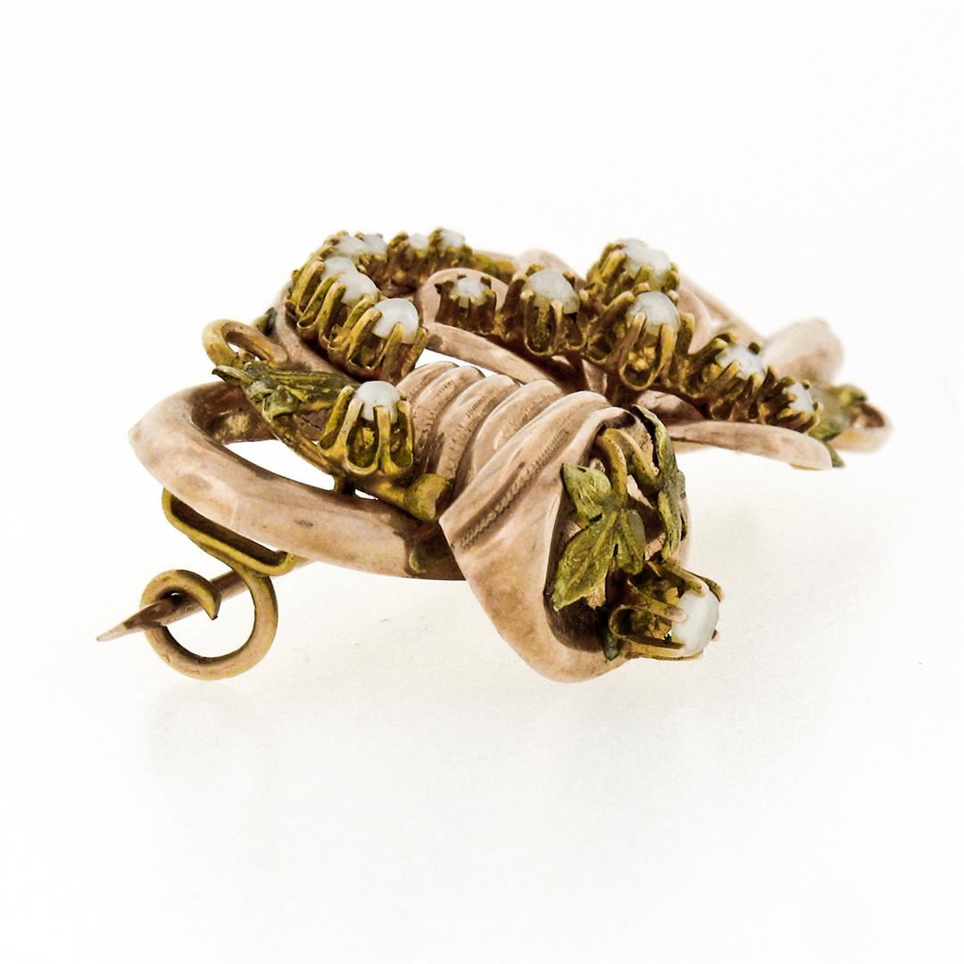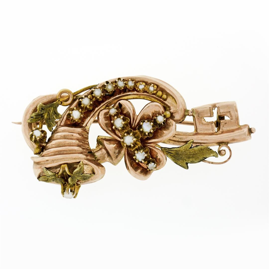 A Victorian era 12k rose and green gold flower and leaf bouquet brooch featuring 17 natural seed pearls (1.2mm to 2.5mm). Measures 54.00x25.55mm and weighs a total of 7.88 grams.
