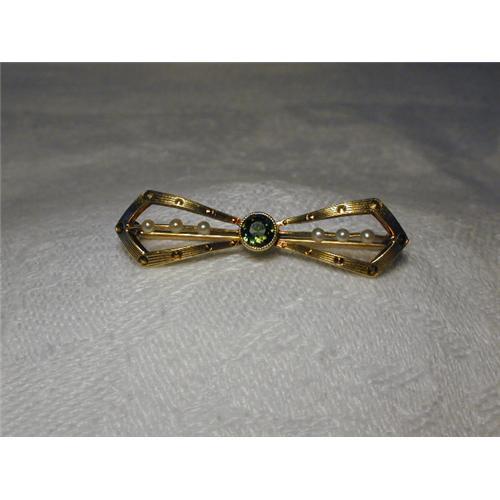 <table width="100%" border="0" cellspacing="0" cellpadding="4"><tr><td><em> </em></td></tr><tr> <td width="100%"> You are looking at a rare estate 14K yellow gold Victorian pin with green tourmaline and seed pearls. There are 6 seed pearls and one natural green tourmaline. The piece measures 1 and 3/8 of an inch long by 3/8 of an inch wide. It weighs 2.4 grams. It is in mint condition. </td></tr><tr> <td> </td></tr><tr> <td>Reference #: Mali_Broo_004</td></tr><tr><td>Condition:mint</td></tr><tr><td>Year:post-1945</td></tr><tr><td>Title:Victorian 14K Seed Pearl Tourmaline Brooch Pin</td></tr><tr><td>Location:New York</td></tr></table>