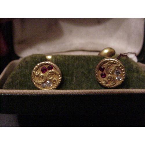 Exquisite Turn of the Century Circa 1895 - 1900 14kt yellow gold and diamond and ruby cufflinks in great condition. Exquisite chased gold work elaborately done. Fabulous set of cufflinks. A must have!!