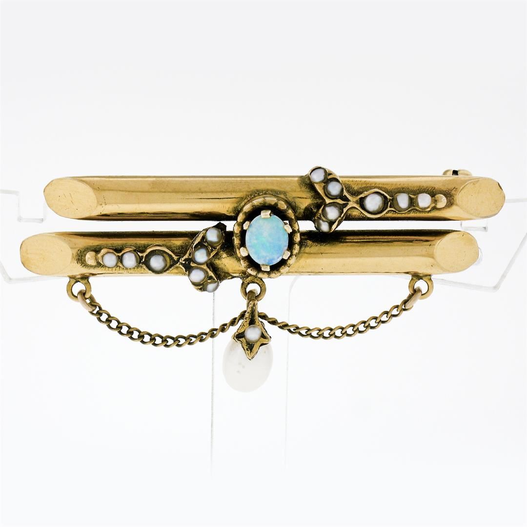 A Victorian era 14k yellow gold dual bar pin featuring an oval cabochon opal (4.90x4.15mm), 15 round natural seed pearls (1.75 to 1.95mm), and an egg shaped natural pearl dangle (5.00x6.16mm). Measures 48.5x23.0mm and weighs a total of 7.66 grams.