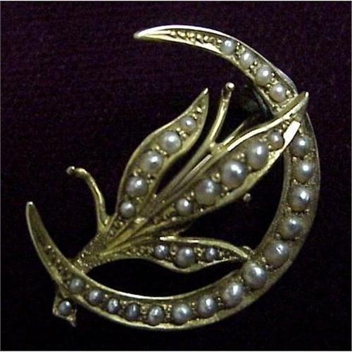 Lovely English 14k detailed brooch, featuring Moon and the leafs, all encrusted with pretty seed pearls 31 in total. Excellent condition. Brooch measures about 1" x 1/2", US Buyer please pay 6.00 for shipping plus insrance, We prefer Paypal payments, Thanks for looking!