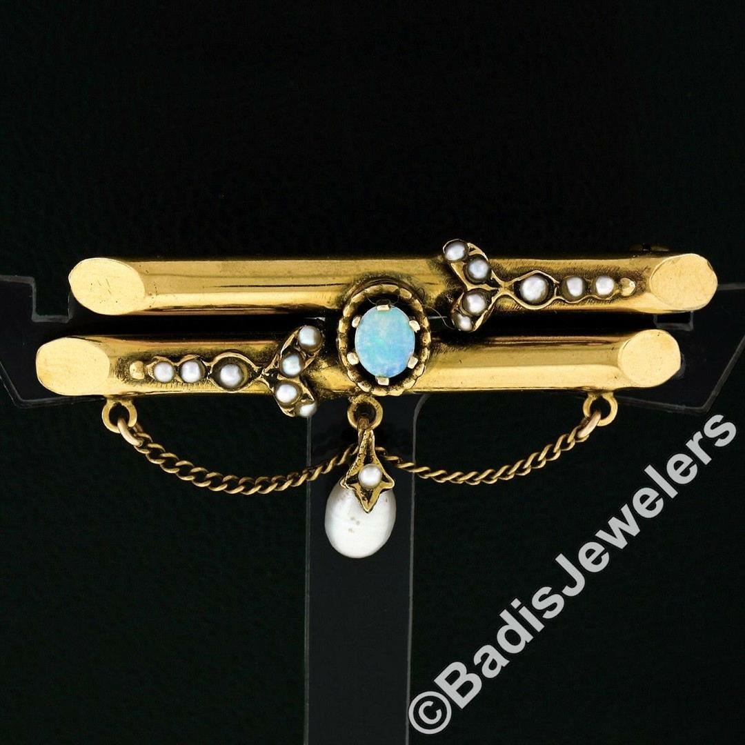 A Victorian era 14kt yellow gold dual bar pin featuring an oval cabochon opal (4.90x4.15mm), 15 round natural seed pearls (1.75 to 1.95mm), and an egg shaped natural pearl dangle (5.00x6.16mm). Measures 48.5x23.0mm and weighs a total of 7.66 grams.