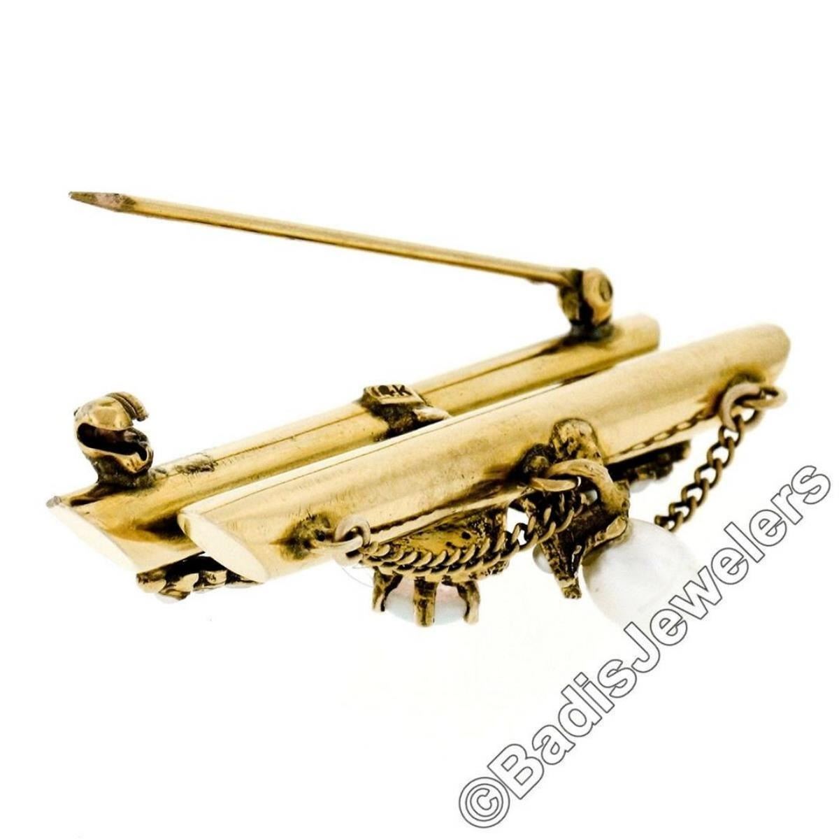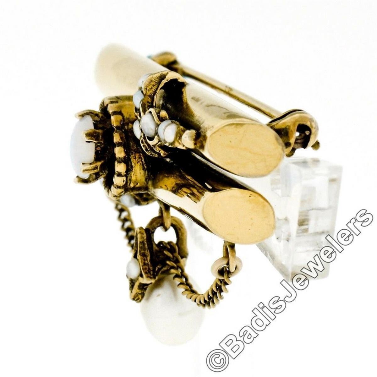 Victorian 14kt Gold Opal, Seed Pearl, & Natural Pearl Dangle Dual Bar Brooch