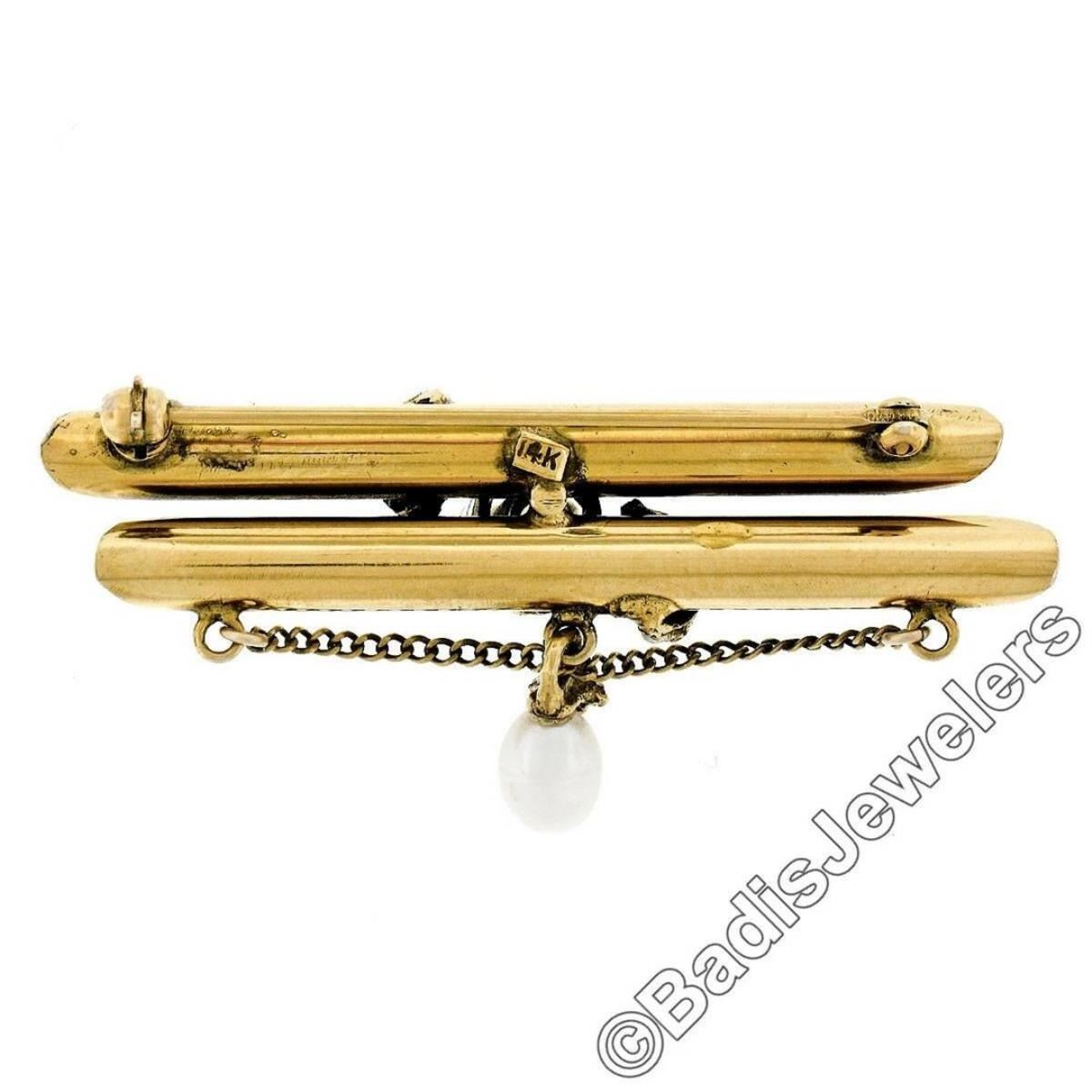 Victorian 14kt Gold Opal, Seed Pearl, & Natural Pearl Dangle Dual Bar Brooch