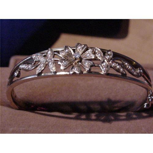 Delicate and feminine diamond (approx .05 ct) and pearl hinged stiff Victorian bracelet set in 14kt (marked 14k) yellow gold with "8" shaped safety. Lovely piece in great condition. Fits average size wrist. Lovely piece.