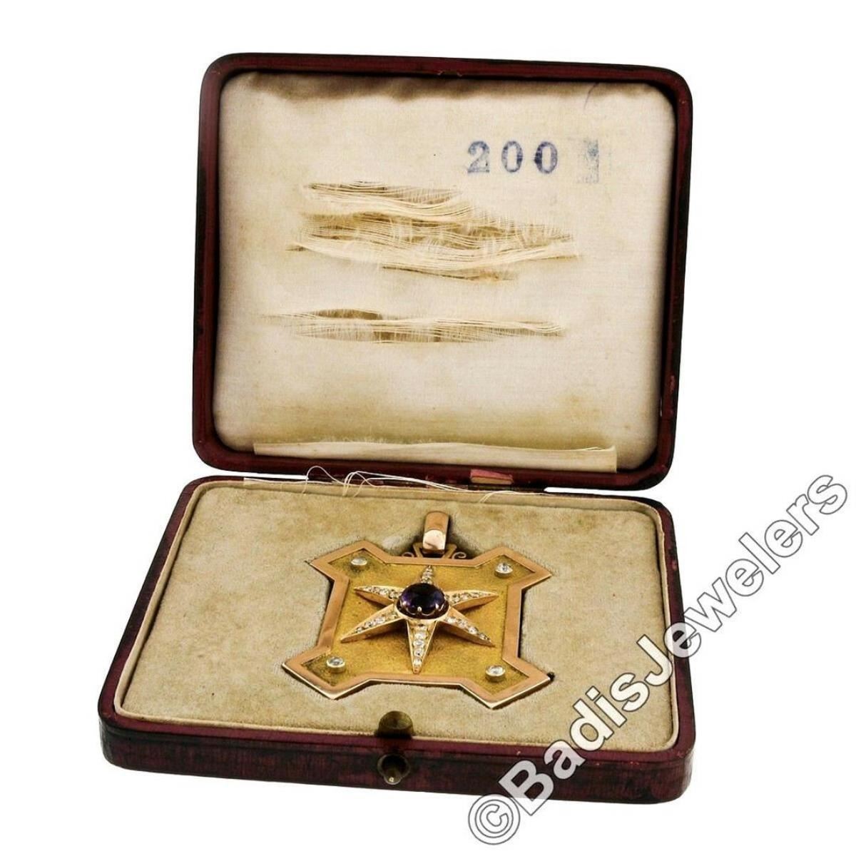 A large, hand-crafted, Victorian era locket pendant crafted from 15kt rose and yellow gold featuring a prong set 2.60ct round amethyst at the center of 1.80ctw of old mine and European cut diamonds (G to I - VS2 to SI2) in a six-ray star pattern. The pendant weighs a total of 63.76 grams, measures 74.66x53.22mm including the bail, and the inside of the bail measures 9.00x7.25mm. Comes with its original custom fitted box.