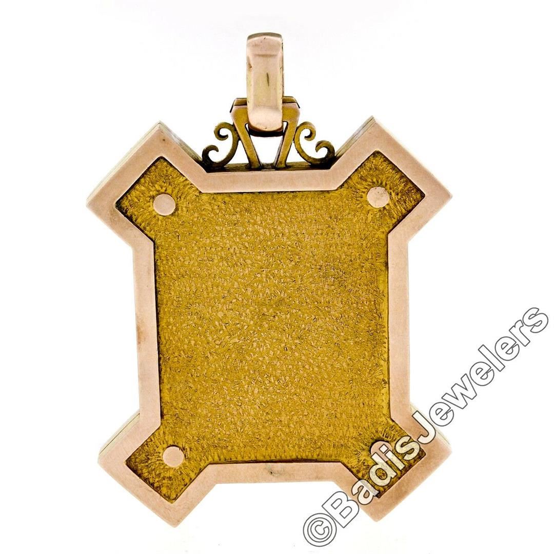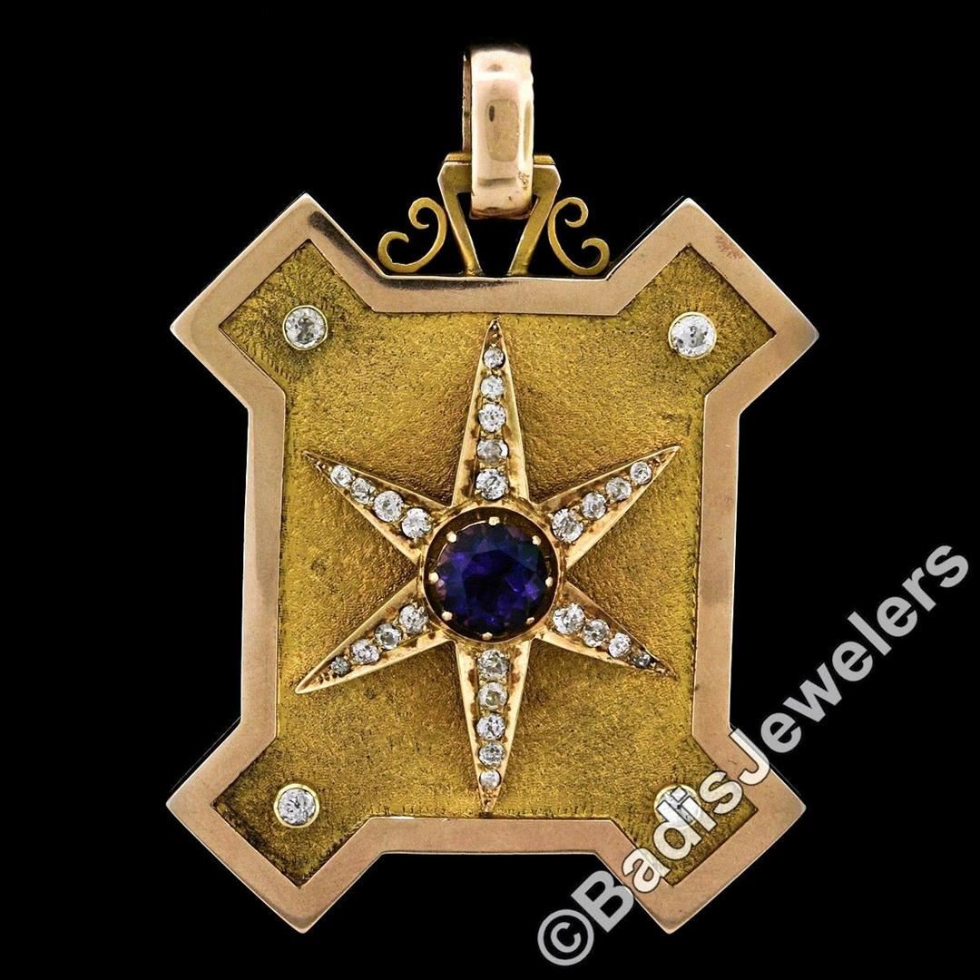 A large, hand-crafted, Victorian era locket pendant crafted from 15kt rose and yellow gold featuring a prong set 2.60ct round amethyst at the center of 1.80ctw of old mine and European cut diamonds (G to I - VS2 to SI2) in a six-ray star pattern. The pendant weighs a total of 63.76 grams, measures 74.66x53.22mm including the bail, and the inside of the bail measures 9.00x7.25mm. Comes with its original custom fitted box.