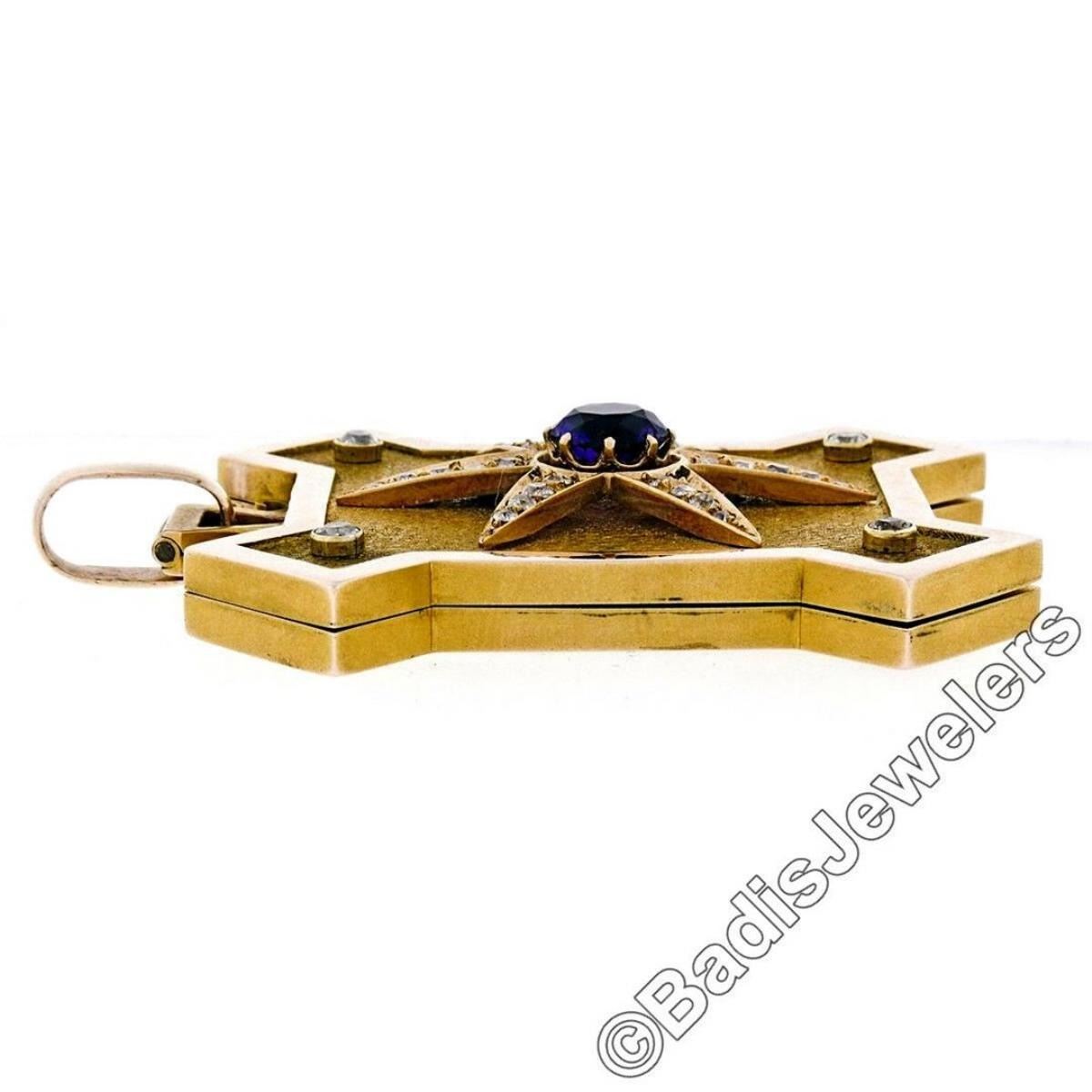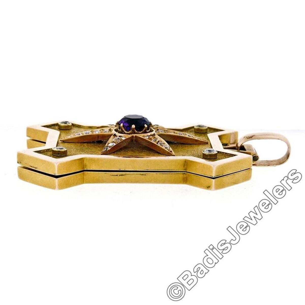 A large, hand-crafted, Victorian era locket pendant crafted from 15kt rose and yellow gold featuring a prong set 2.60 ct round amethyst at the center of 1.80 ctw of old mine and European cut diamonds (G to I - VS2 to SI2) in a six-ray star pattern. The pendant weighs a total of 63.76 grams, measures 74.66x53.22mm including the bail, and the inside of the bail measures 9.00x7.25mm. Comes with its original custom fitted box.