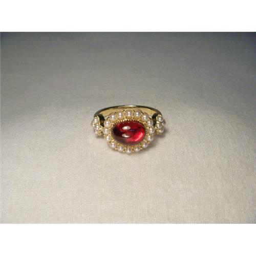 <tr><td>Title:Victorian 18K Garnet Seed Pearl Filigree Ring</td></tr>