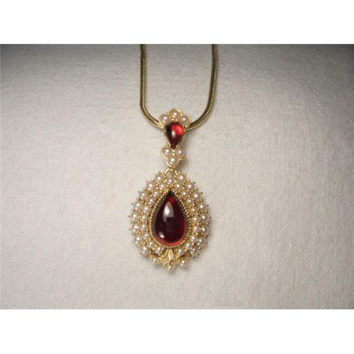 You are looking at a victorian 18K yellow gold garnet and seed pearl filigree pendant / enhancer. This beautiful piece features one pear shaped cabochon garnet measuring 10 mm by 8 mm and one smaller garnet measuring 6 mm by 4 mm. The piece also features 44 round seed pearls. All gemstones are natural. This pendant measures 1 and 1/4 of an inch long by 5/8 of an inch wide. It weighs 5.1 grams. It is in mint condition.