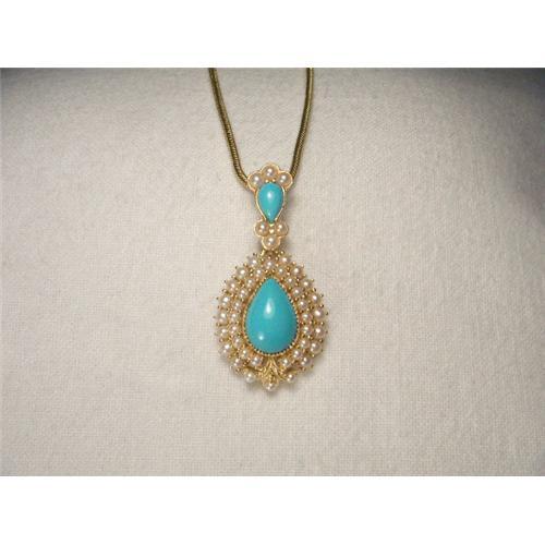 You are looking at a victorian 18K yellow gold turquoise and seed pearl filigree pendant / enhancer. This beautiful piece features one pear shaped cabochon turquoise measuring 10 mm by 8 mm and one smaller turquoise measuring 6 mm by 4 mm. This piece also features 44 round seed pearls. All gemstones are natural. This piece measures 1 and 1/4 of an inch long by 5/8 of an inch wide. The pendant weighs 5 grams. It is in mint condition.