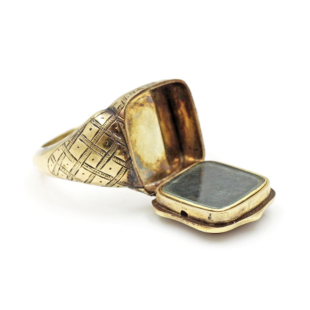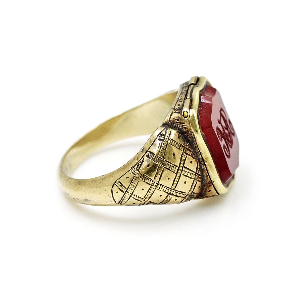 Victorian 18k Gold Carnelian Poison Ring. Top opens as a secret compartment for carrying small objects.