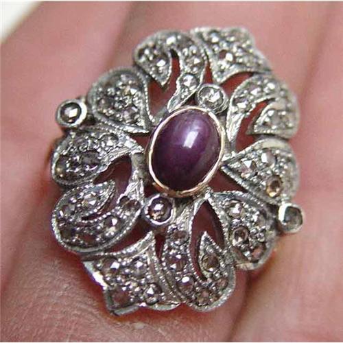 <table width="100%" border="0" cellspacing="0" cellpadding="4"><tr><td><em> </em></td></tr><tr> <td width="100%"> Fancy Open Work Victorian Style 18kt Yellow and White Gold Diamond Cabochon Ruby Lady's Ring, size 8.5 </td></tr><tr> <td> </td></tr><tr> <td>Reference #: JLR_091</td></tr><tr><td>Condition:Excellent</td></tr><tr><td>Year:20th Century</td></tr><tr><td>Height:8.5 (ring size)</td></tr><tr><td>Title:Victorian 18kt GOLD RING Diamond RUBY 18k</td></tr><tr><td>Location:Long Island, NY</td></tr></table>