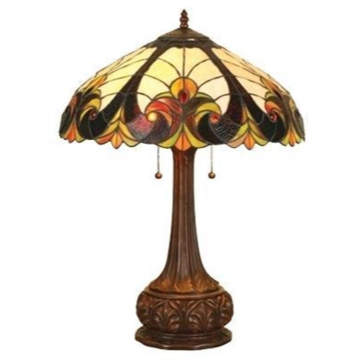 "LIAISON" Victorian 2 Light Table Lamp 18" Shade Shade Width18 Shade HeightN/A Overall Height24 Base WidthN/A Base HeightN/A Threaded Pipe/Finial LengthN/A Net Weight (lbs)13 Light DirectionDownlight Wattage/Bulb Types(2) 100 Watt max E26 Type A Bulb (not included) Power SourceCorded, Electric Electric Wire LengthN/A Switch TypeOn-Cord Foot Stepper Shade ShapeRound Shade MaterialsTiffany-glass Glass Thickness0.12 Est. Glass Cuts306 Est. Glass Beads18 FinishDark Antique Bronze Overall MaterialsGlass, metal, and electrical components Specific UsesIndoor Consumer NoticeProposition 65 CertificationUL Listed UPC Code837654455968