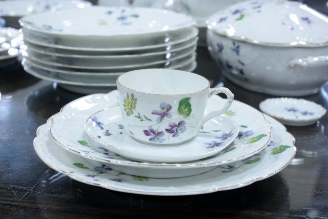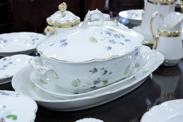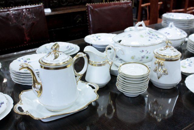 Including: 12 dinner plates (2 cracked), 12 soup bowls (2 cracked, 1 chipped), 12 cake plates (1 cracked), 1 soup tureen, 2 platters (1 cracked), 1 covered vegetable bowl, 1 pickle dish, 4 cups (3 cracked), 6 saucers, 4 butter plates. Haviland