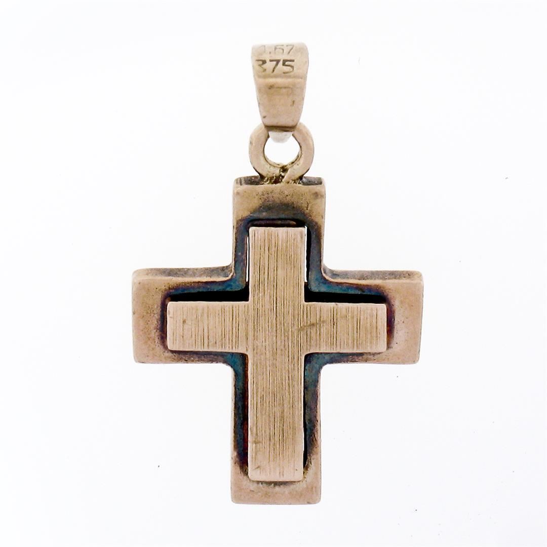 A Victorian era 8k rose gold reversible cross pendant featuring a brushed inner section surrounded by a polished frame. The pendant weighs a total of 2.01 grams, measures 26.6x15.0mm including the bail, and the inside of the bail measures 4.0x3.5mm.