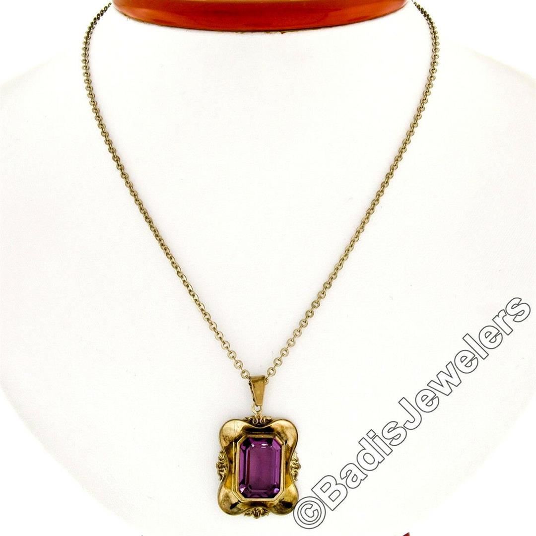 A Victorian era 8kt yellow gold pendant necklace featuring a bezel set octagonal cut amethyst (14.0x10.0mm; 7.25ct). 24 inch cable link chain, 6.63 grams total weight, pendant measures 32.25x19.40mm.
