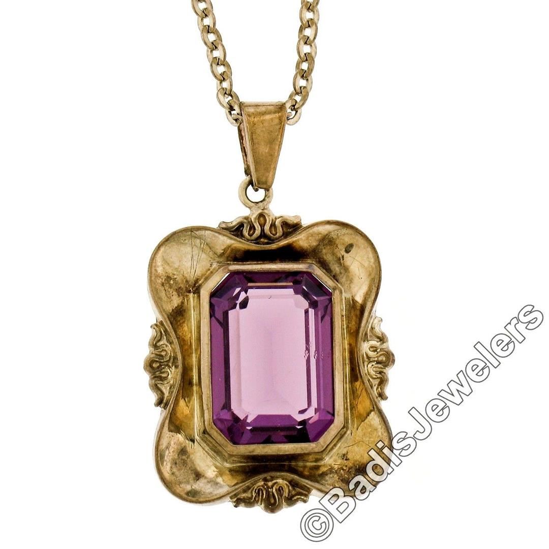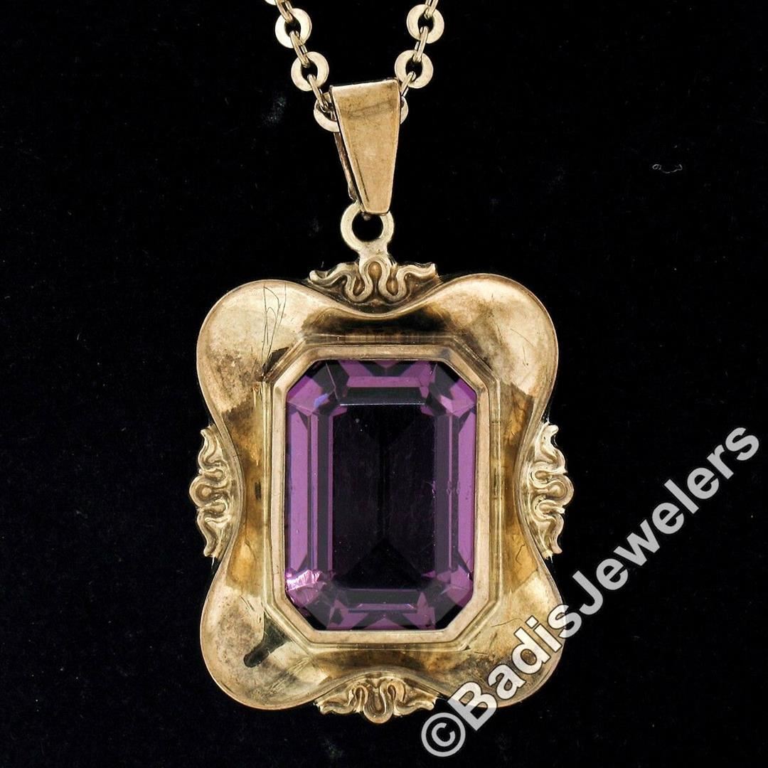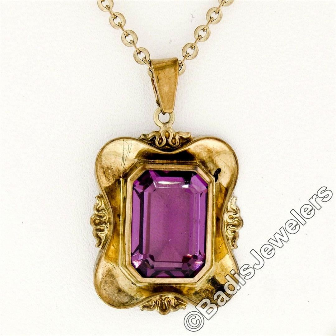 A Victorian era 8kt yellow gold pendant necklace featuring a bezel set octagonal cut amethyst (14.0x10.0mm; 7.25ct). 24 inch cable link chain, 6.63 grams total weight, pendant measures 32.25x19.40mm.