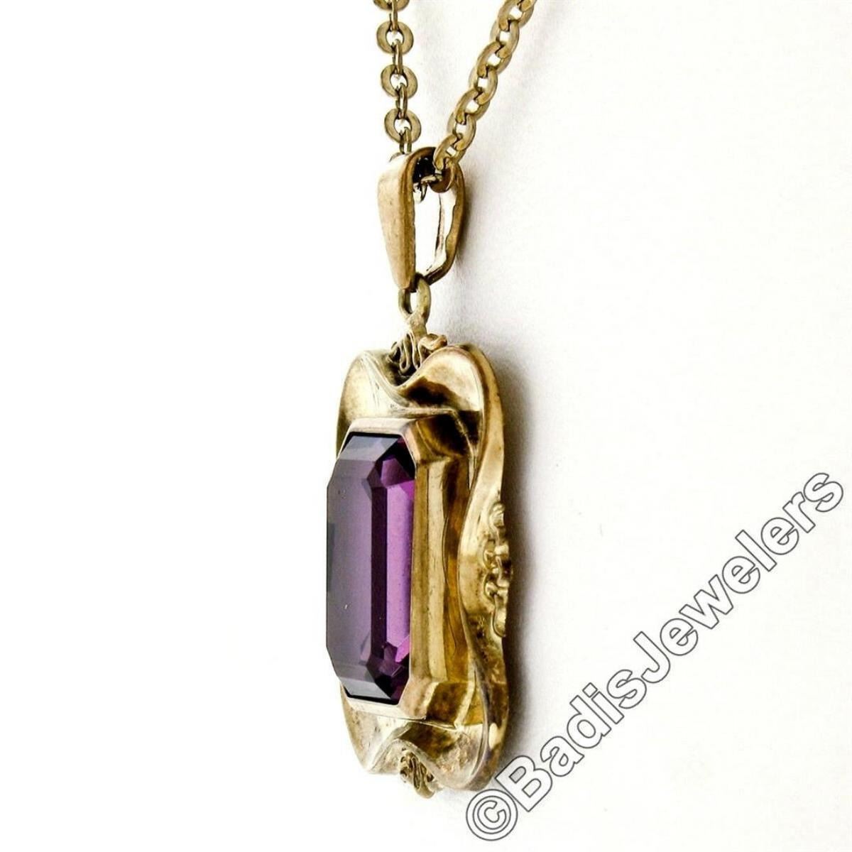 A Victorian era 8kt yellow gold pendant necklace featuring a bezel set octagonal cut amethyst (14.0x10.0mm; 7.25ct). 24 inch cable link chain, 6.63 grams total weight, pendant measures 32.25x19.40mm.