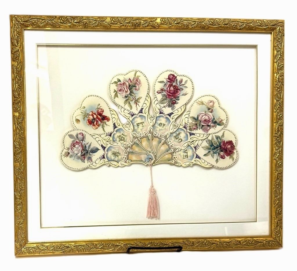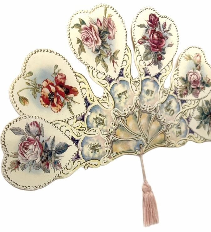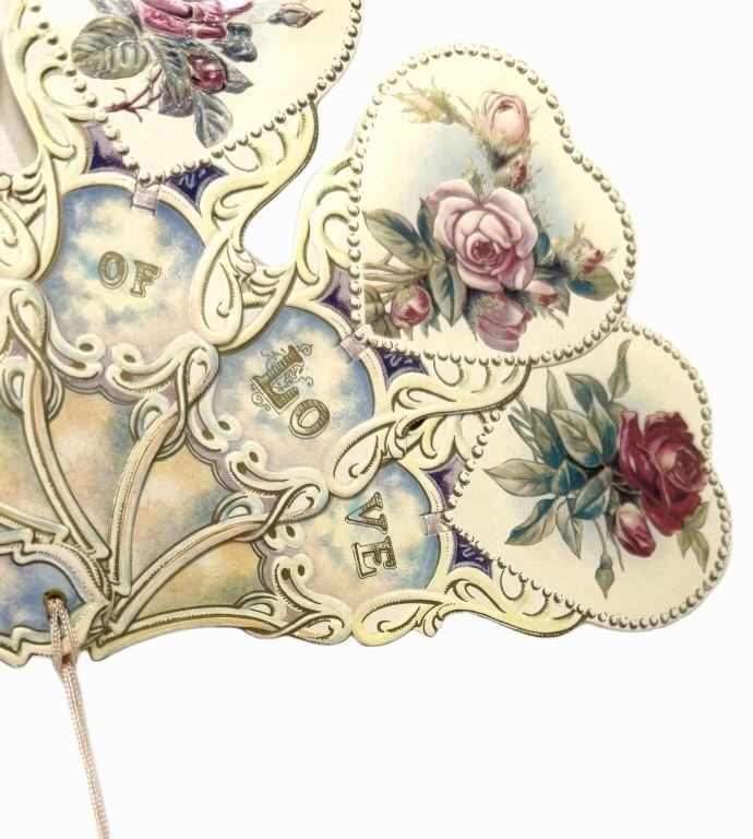 Item/Description: Paper die-cut fan, often referred to as a "lover's fan" or "Valentine fan." The fan is constructed from embossed, die-cut paper, featuring detailed floral illustrations of roses. It is typically associated with the Victorian era and was often given as a Valentine's Day gift. When unfolded, the individual heart-shaped panels of the fan spell out the message "A Gift of Love."