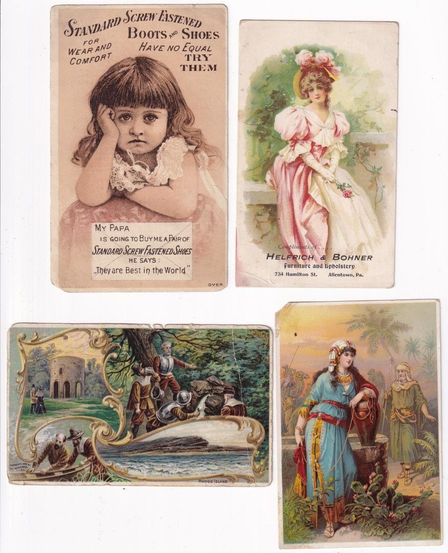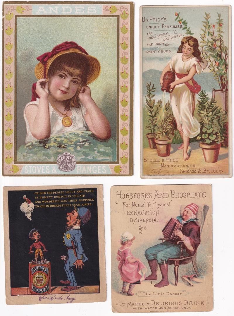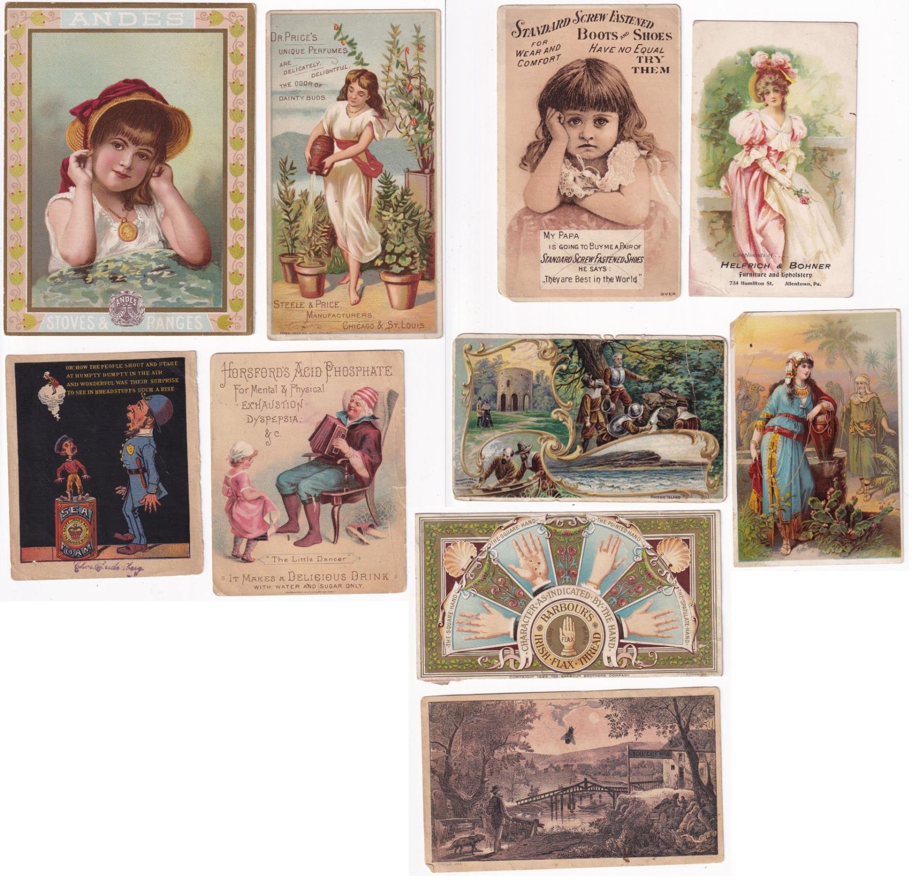 Largest is 4 1/2" by 6". These lithographs were used by businesses to promote various products, including stoves, perfumes, shoes, and health tonics.