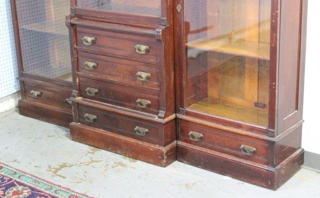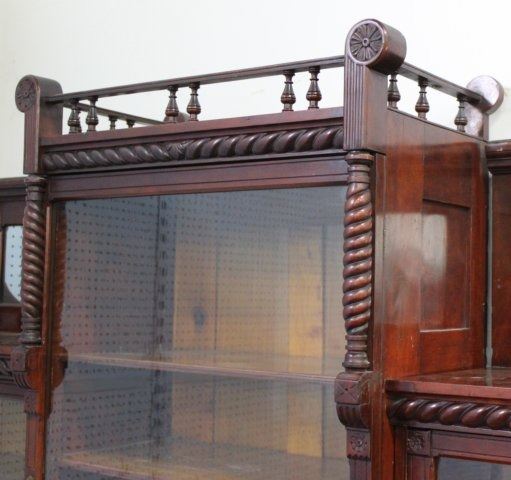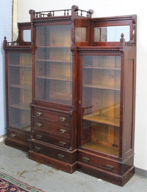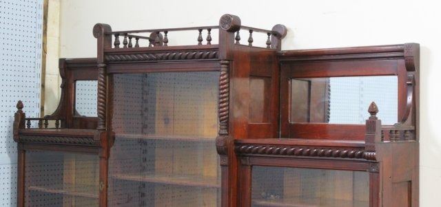 3-sectional with spindle design. Mirrored top. With wood shelves. Approx. 79" H x 75" W x 17" D. (6032)