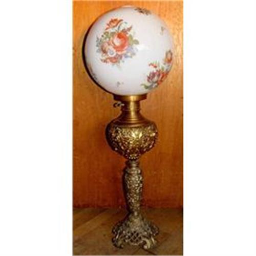 An electrified Victorian high relief parlor lamp with huge flower adorned milk glass globe which would make a superb addition to any fine household or collection.