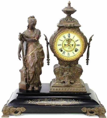 Victorian Ansonia statue clock22" tall, 8 day time and strike with open escapement, very good original condition with recent cleaning and adjustment, the key and pendulum included. From Jerome Klingfus collection. Est. 450-800