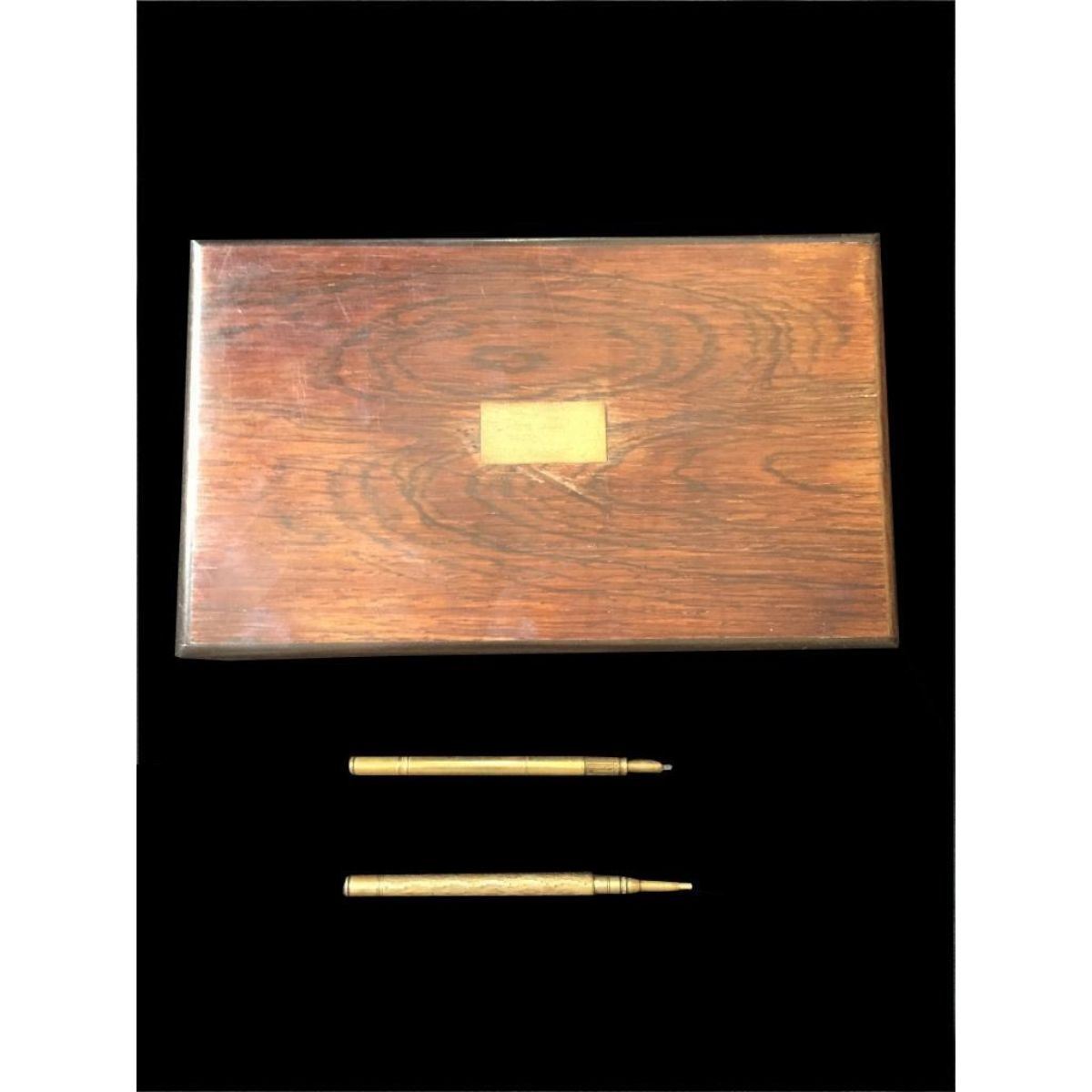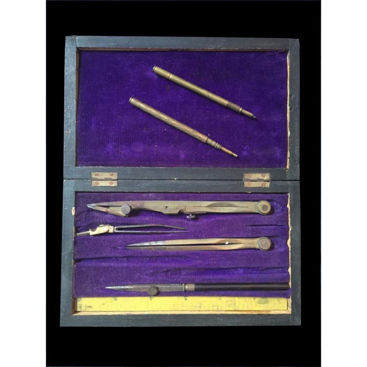 Victorian era, late 19thc - early 20th century architect's draughtsman cased set, along with two brass propelling, mechanical pencils. Rosewood case with brass latches & cartouche. Inside purple velvet lined & slotted.