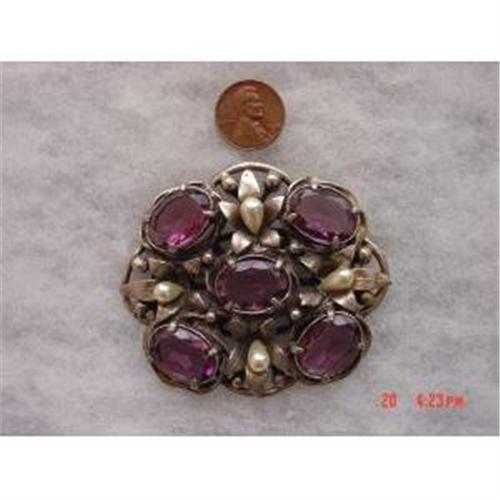 Here is the most beautiful brooch or sash pin I have ever seen!!! It is huge 2 1/2 inches tall and 3 inches wide! There are 5 large 20mm amethyst faceted stones!! I'm thinking these are real, but I 'm no gemologist? They are hand placed and held firmly intact by 4 large individual prongs each. THere are 4 pearls around these. The leaves are finely intricately detailed! What an incredible brooch. I'm thinking 1880-1930s? I do not know if this is sterling? or what type of metal, quite heavy. Good condition