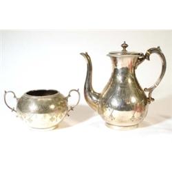 Victorian Art Nouveau style teapot and twin handled sugar bowl, chased with stylized flowers, 30cm high