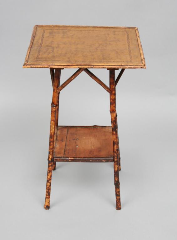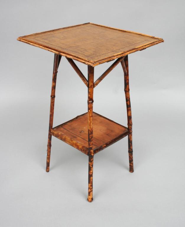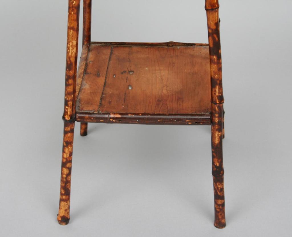 The squared top raised over four flared bamboo legs connected with bamboo stretchers. 26"H. 16 3/4"W. Condition: some light wear and imperfections, including some light scratches and scuffs, generally good.