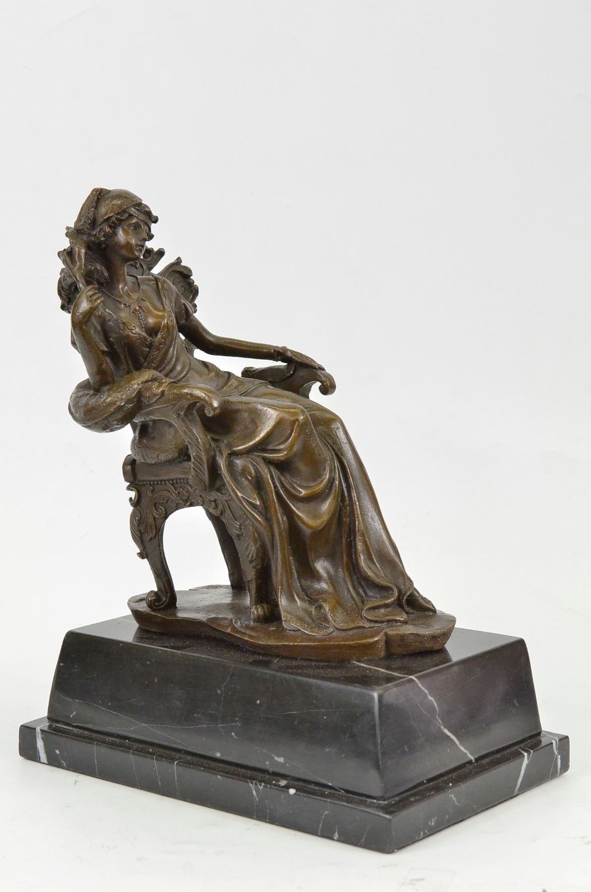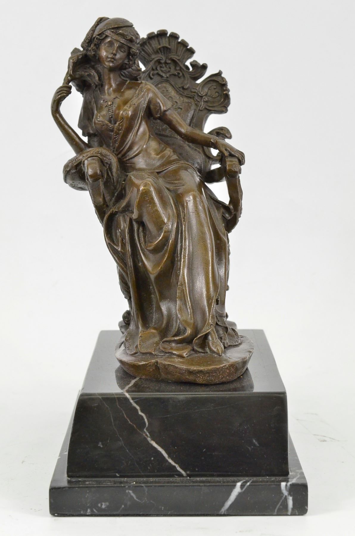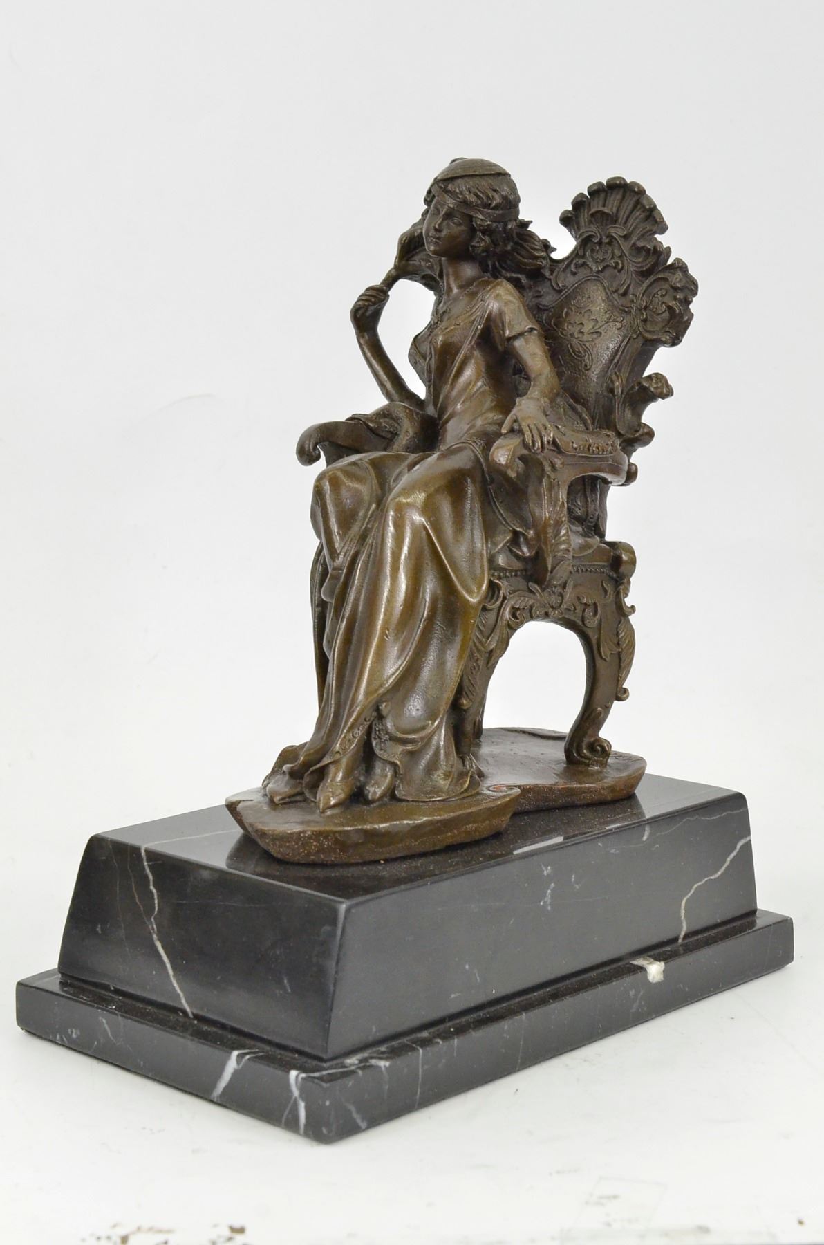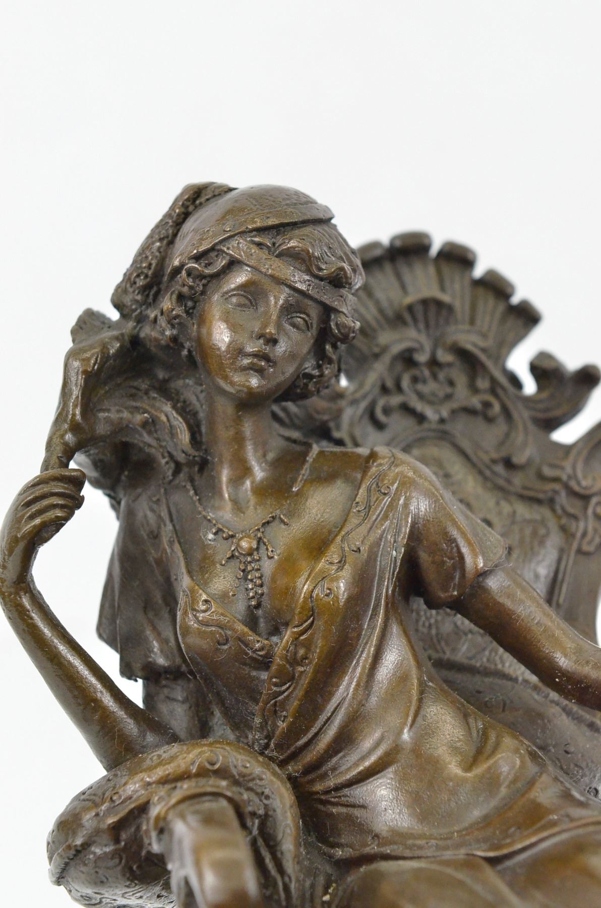 The Victorian Beauty Sits On A Exquisitely Detailed Arm Chair In Her Tall-Ceiling And Finely Furnished Parlor. She Sits August And Carefree As She Listens To Gossip From A Guest. The Details In This Sculpture Are Absolutely Remarkable, With The Gold Patina Accents And Contrasts Adding To Its Allure. The Texture And Sculpt Of Her Dress Is So Representational That It Transforms A Hard Material Into A Real Silk Fabric. The Handmade Bronze Sculpture Was Molded Using The Ancient Method Of Lost-Wax Casting And With Skin Tones Stained With A Brown Patina Finish For Preservation. It Is Mounted Upon A Black Marble Base. Bronze dimensions with marble base: Height 12 X Width 9 inches. Weight: 20 lbs. Please Note: This is a reproduction bronze sculpture from the original molded and signed. This featured bronze sculpture is a recast after the original, and has been done recently. This 100% bronze sculpture is an abstract piece certain to be a conversation piece.