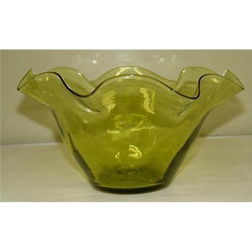 Vintage pea soup green tone 19th century Victorian blown glass center bowl with shapely undulating rims, rich color and visible air bubbles throughout as well as an unpolished pontil on the underside. SIZE: 10 inches diameter, 5 1/8 inches height. CONDITION: Very good.