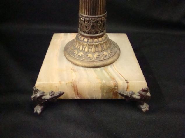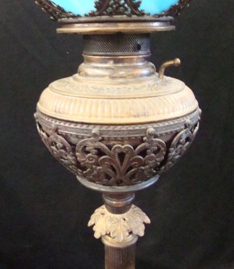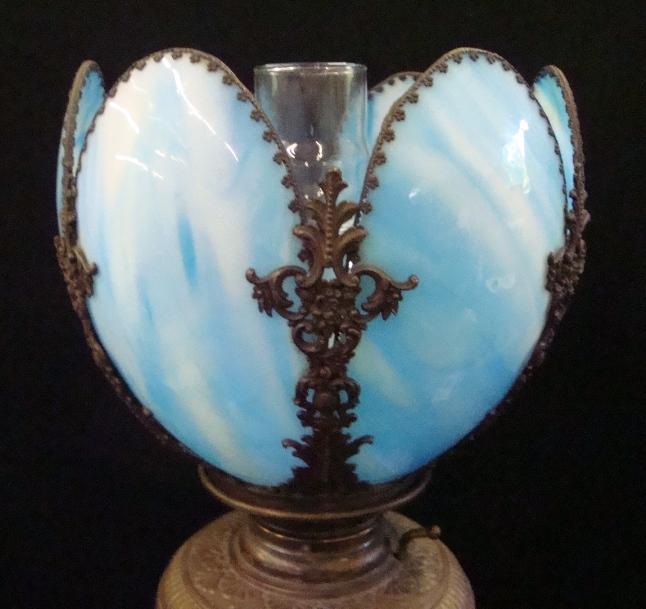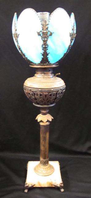 Very nice tall, brass marble and blue slag glass oil lamp with original chimney. The burner has been removed but the lamp has not been converted. Very pretty. The shade is 10" in diameter. The lamp is 28" tall. Classic parlor lamp