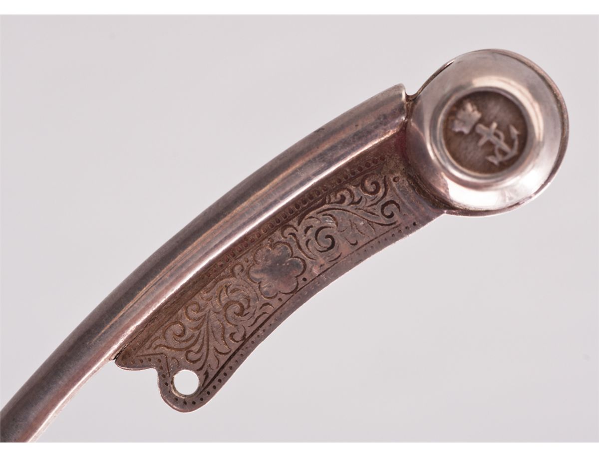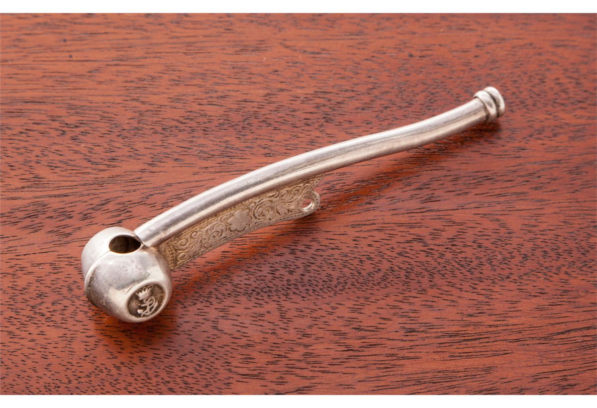 Silver Victorian Boatswain's Call or Whistle, ca. 1860-1900, approx. 4'' in length, with barrel-shaped buoy and crown over anchor at each end. Keel is lightly engraved with floral motif and line and punchdot border. This two-note type whistle was used for signaling and piping aboard personnel. Condition is excellent showing light toning to silver metal surfaces with light patination in protected areas. Est.: $200-$300.