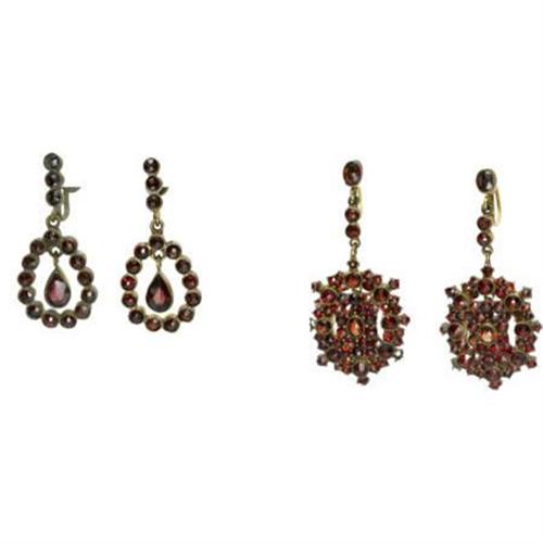 <B>Victorian Bohemian Garnet, Yellow Metal Earrings</B></I><BR><BR>The collection includes: one pair of earrings, each centering a dangling pear-shaped garnet, encircled by round-cut garnets, set in yellow metal, completed by a screwback clip (Dimensions: 1-3/8 inches x 5/8 inch); together with one pair of earrings, each suspending a cluster formed by oval and round-shaped garnets, set in yellow metal, completed by a screwback clip (Dimensions: 1-3/4 inches x 13/16 inch). Gross weight for the earrings collection is 13.90 grams.<BR>Note: earrings are designed for non-pierced ears)<BR><BR> <B>Condition Report:</B> Good condition. The first pair of earrings has 1 garnet missing. The second pair of earrings has 3 garnets missing.<BR><BR><b>Shipping:</b> Miscellaneous Collectibles, Smal (<a target="_blank" href="http://www.heritageauctions.com/common/shipping.php">view shipping information</a>)