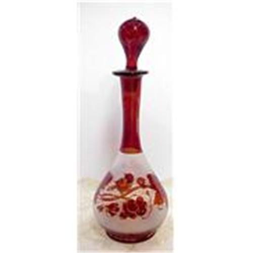 Lovely antique colognr/perfume decanter - This dates to late 1800's and it is part ruby color glass and frosted glass - Mouth blwn and very, very fine-thin - Decoration represents Lovely birds perched on the vine branches with red and gold leaves and grapes - JUST LOVELY!- Stopper is long pear shape almoust all red but for the thin art that fits in to bottle it is frosted - Numbered 774 marked by hand - Thanks for Your visit!
